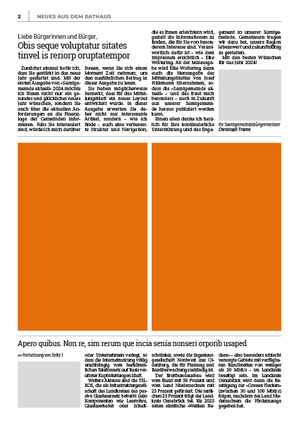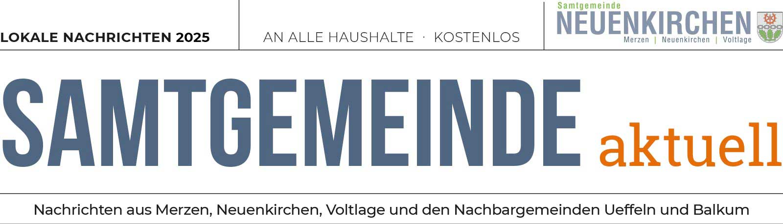 Hier finden Sie die online-Ausgabe der Lokalzeitung »Samtgemeinde aktuell«, die in gedruckter Form an die Haushalte unserer Samtgemeinde verteilt wird. Monatlich berichten wir aus dem Rathaus und unseren Mitgliedsgemeinden, aber auch Beiträge von Gruppen, Vereinen und Verbänden haben hier ihren festen Platz. Es liegt uns am Herzen, neben gesellschaftlichen und kommunalpolitischen Themen allen Ehrenamtlichen eine Plattform zu bieten, über ihre freiwillige Arbeit in Merzen, Neuenkirchen oder Voltlage berichten zu können. Mit der »Samtgemeinde aktuell« schaffen wir uns als kleinste Samtgemeinde im Nordkreis unseren eigenen Lokalteil, in dem wir ausführlich über unser gemeinschaftliches Leben berichten und uns über die Gemeindegrenzen hinweg austauschen können. Wir laden Sie herzlich ein, sich durch eingereichte Beiträge daran zu beteiligen.